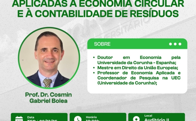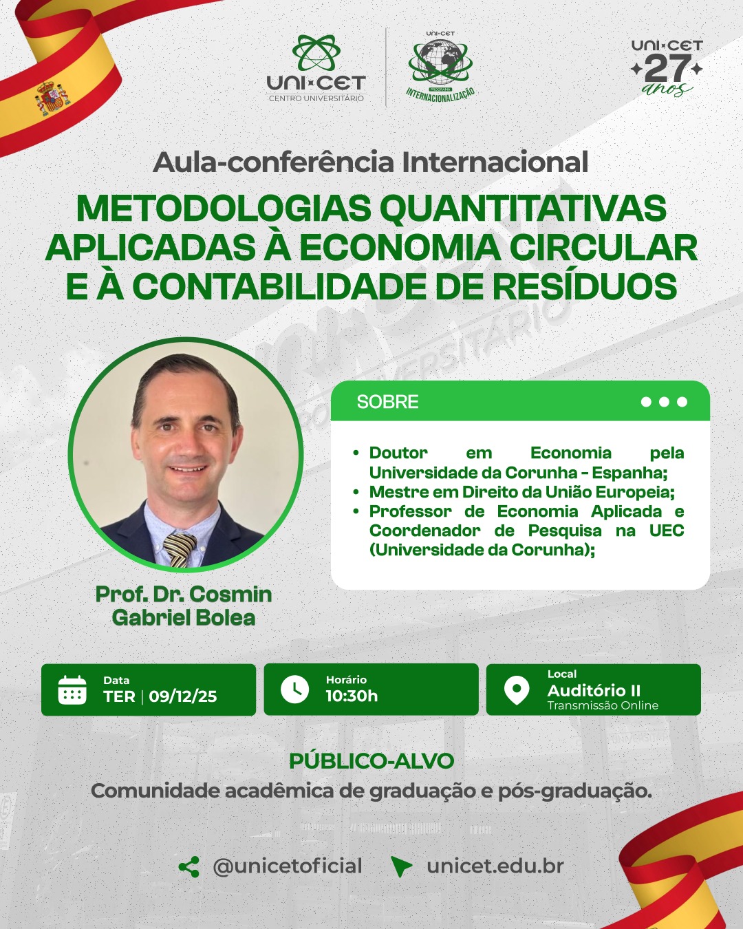 No dia 09 de dezembro, às 10h30, o Auditório II do Centro Universitário UNI-CET recebe a Aula-Conferência Internacional com o renomado Prof. Dr. Cosmin Gabriel Bolea, abordando o tema: “Metodologias Quantitativas Aplicadas à Economia Circular e à Contabilidade de Resíduos”.