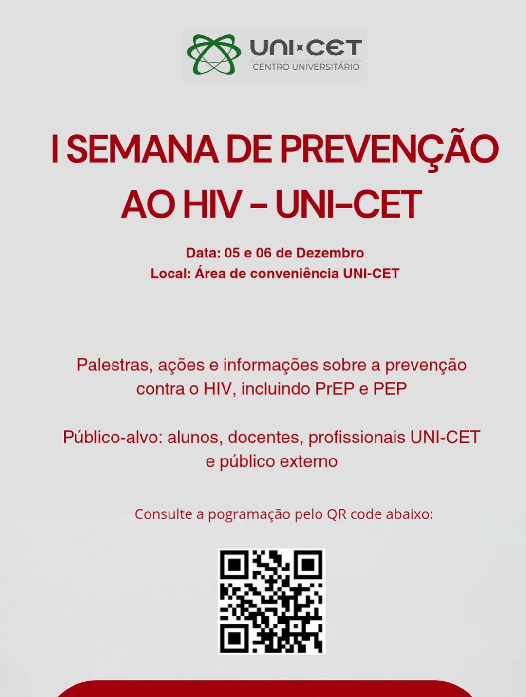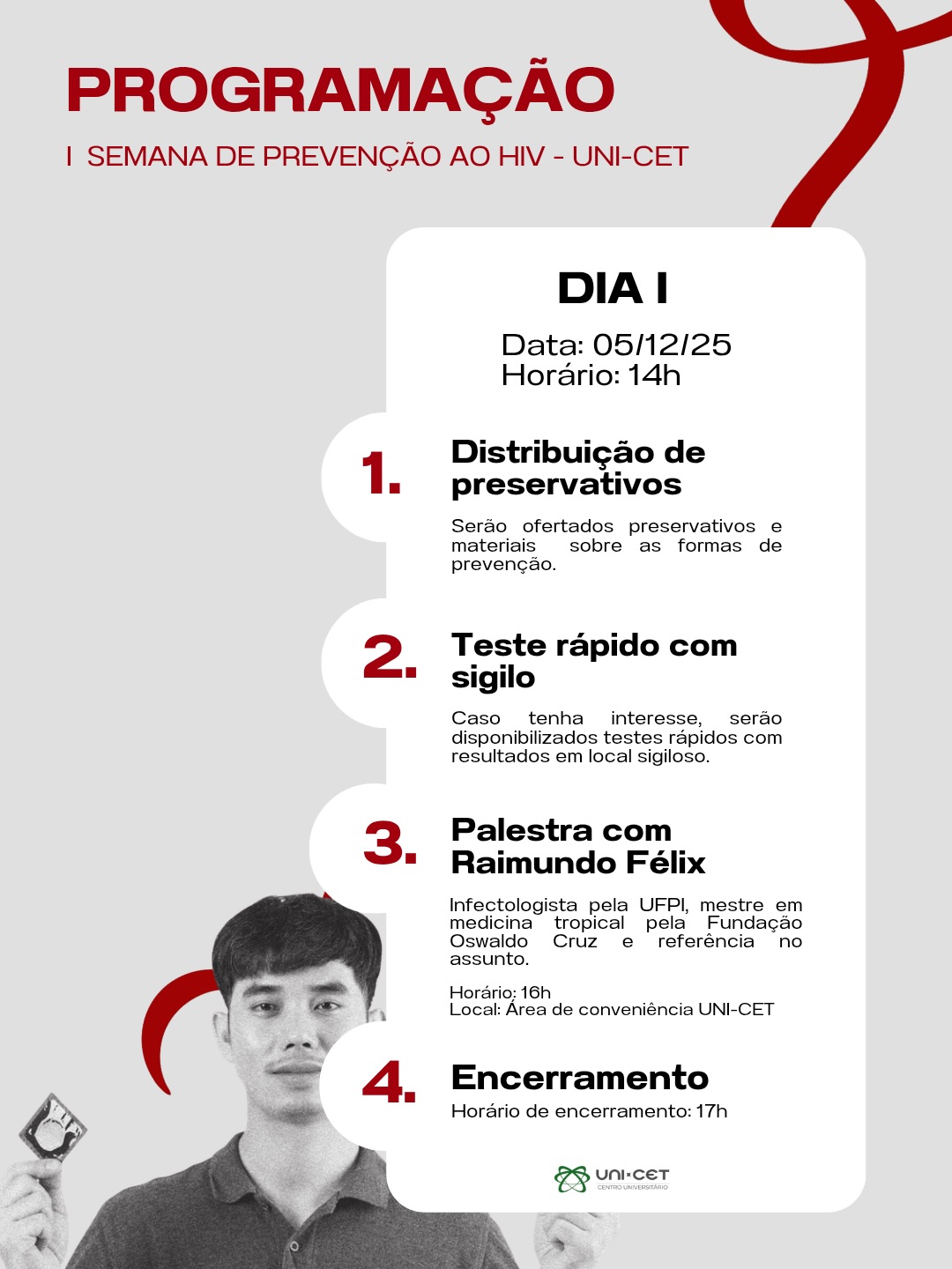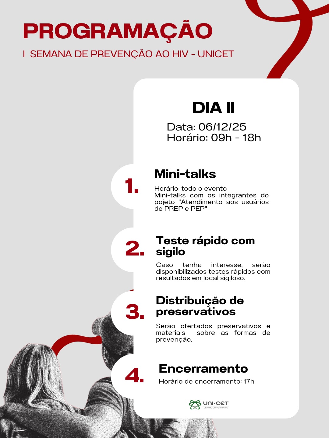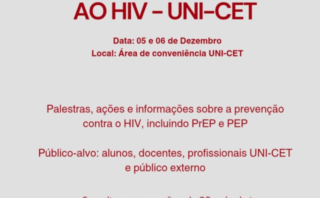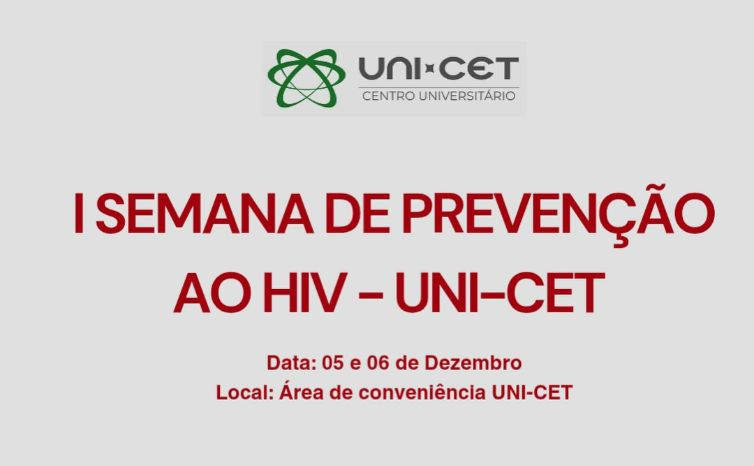 Acontece nos dias 05 e 06/12, a I Semana de Prevenção ao HIV, no Centro Universitário UNI-CET. Neste mês, a campanha Dezembro Vermelho reforça a importância da prevenção, assistência, proteção e promoção dos direitos das pessoas vivendo com HIV, Aids e outras ISTs.