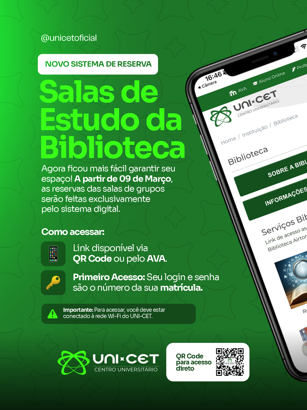 Para realizar a reserva, basta acessar o link disponível por meio do QR Code divulgado pela instituição ou também pelo Ambiente Virtual de Aprendizagem (AVA). O procedimento foi desenvolvido para tornar o acesso às salas mais rápido, eficiente e em sintonia com as práticas digitais adotadas pelo UNI-CET.