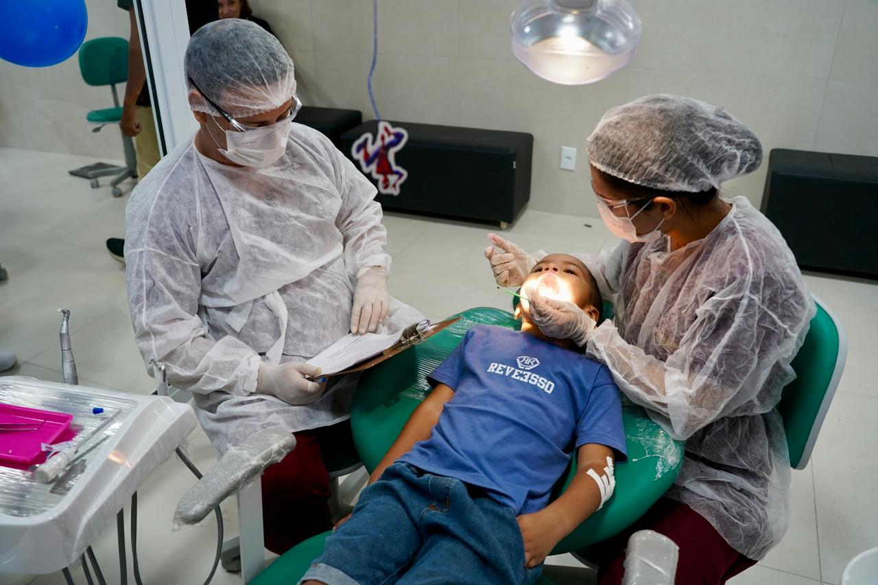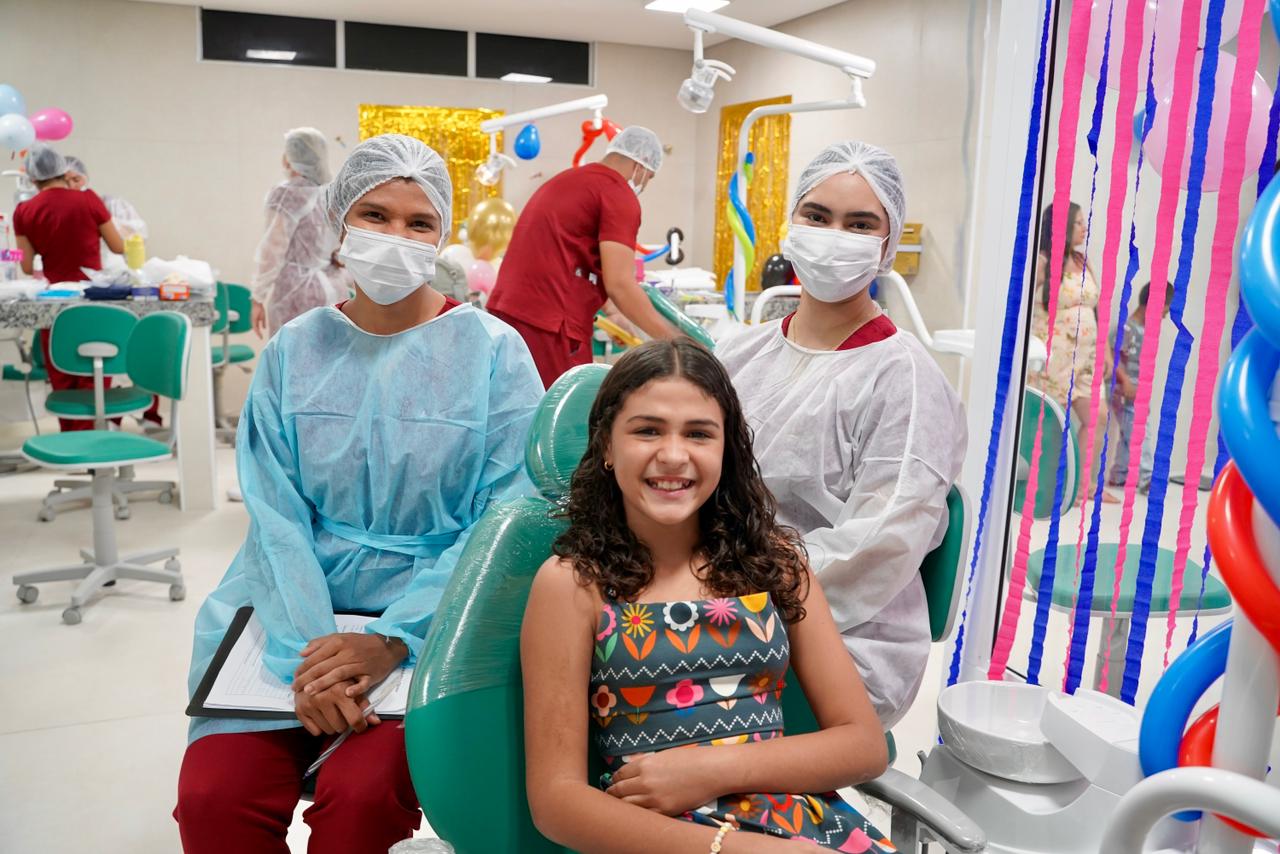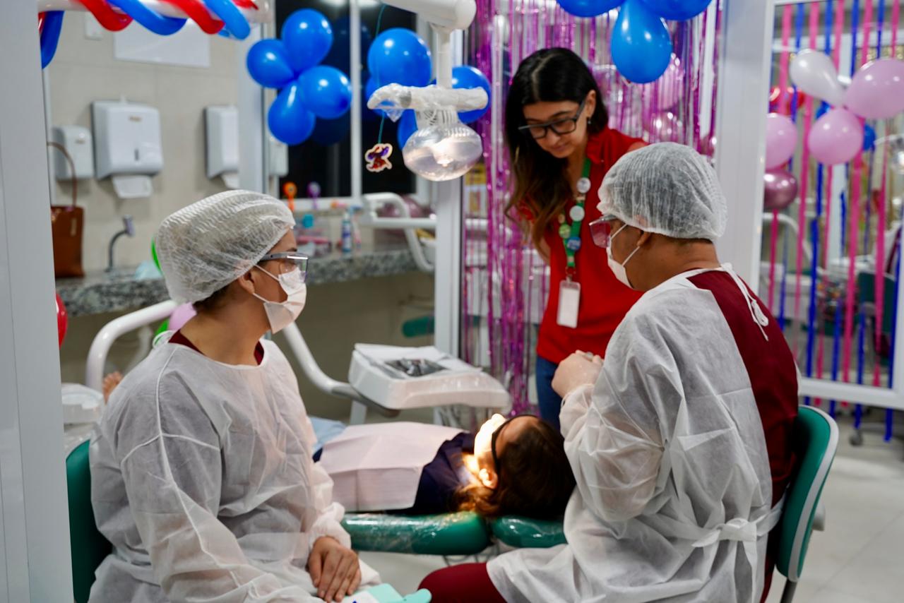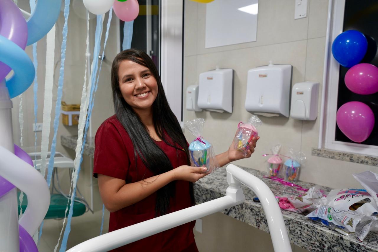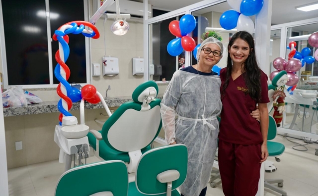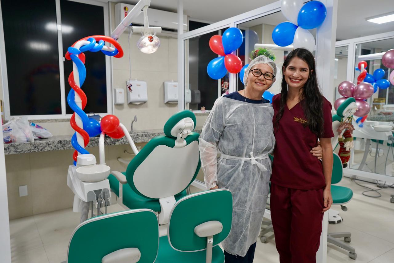 A inauguração já começou com cuidado especializado: os primeiros atendimentos foram de odontopediatria, realizados pelos acadêmicos do 5º período, sob orientação da professora Izabel Quaresma, especialista em Odontopediatria e Pacientes Especiais.