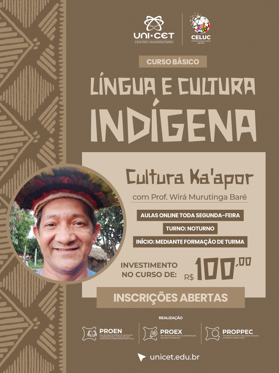 O Centro Universitário UNI-CET está com inscrições abertas para o Curso Básico de Língua e Cultura Indígena, um projeto idealizado pela Pró-reitoria de Ensino de Graduação, Aprendizagem, Cultura, Relação Comunitária e Relacionamento Social (PROEN), através do Núcleo de Relações Internacionais, que busca expandir o conhecimento sobre os povos originários e fortalecer o respeito à diversidade cultural do Brasil.