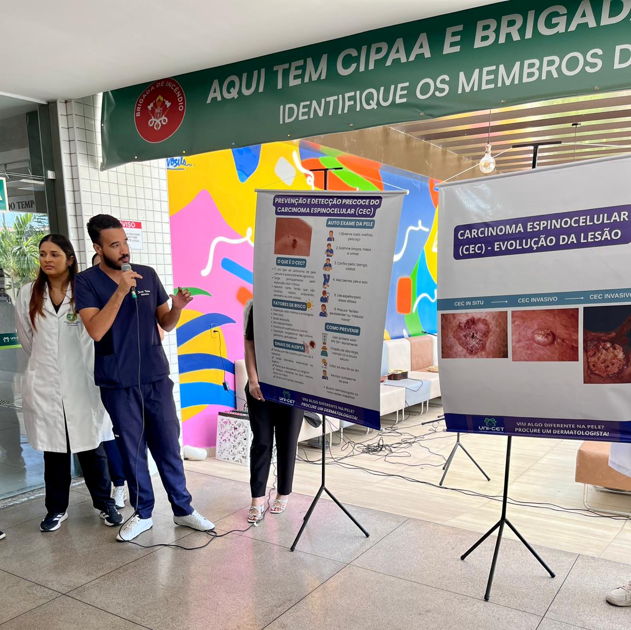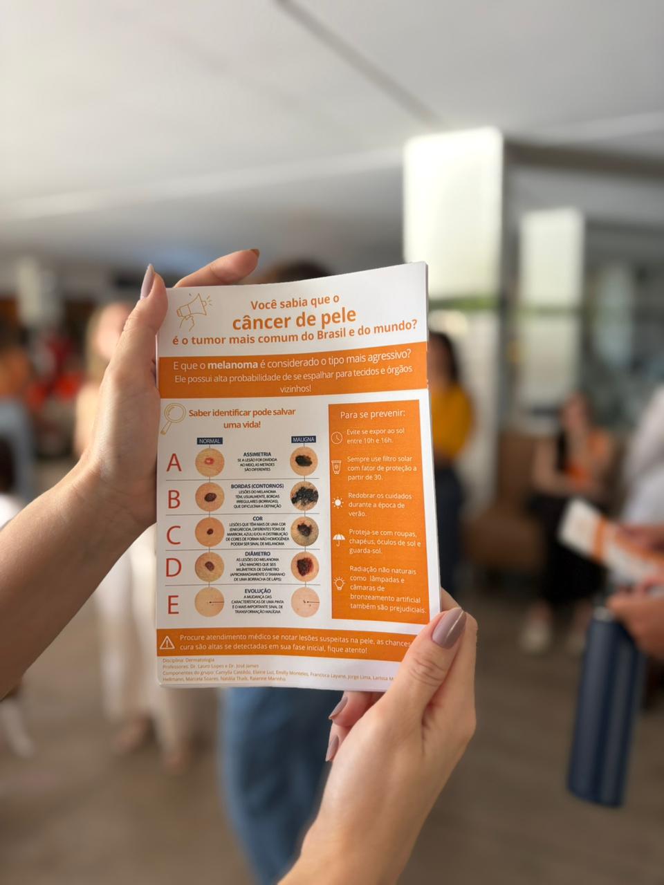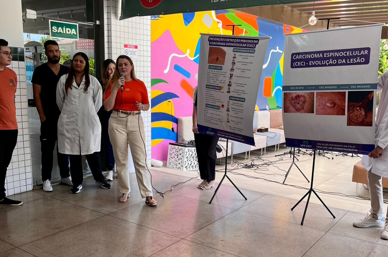 Durante a ação, os acadêmicos apresentaram conteúdos sobre os principais tipos de câncer de pele, como carcinoma e melanoma, destacando sinais de alerta, práticas de autocuidado, a relevância do autoexame e a necessidade de realizar check-up anual com o dermatologista. A atividade também contou com a distribuição de materiais informativos e protetor solar, ampliando o alcance das orientações preventivas.