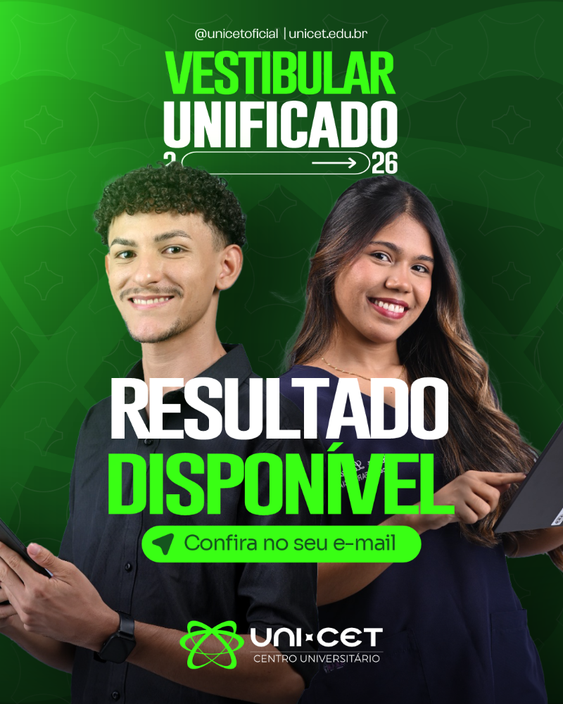 O resultado do Processo Seletivo Vestibular Unificado 2026 do Centro Universitário UNI-CET será disponibilizado via e-mail do candidato. Fique atento à sua caixa de entrada e, para mais informações, entre em contato através do número (86) 99809-4377.
