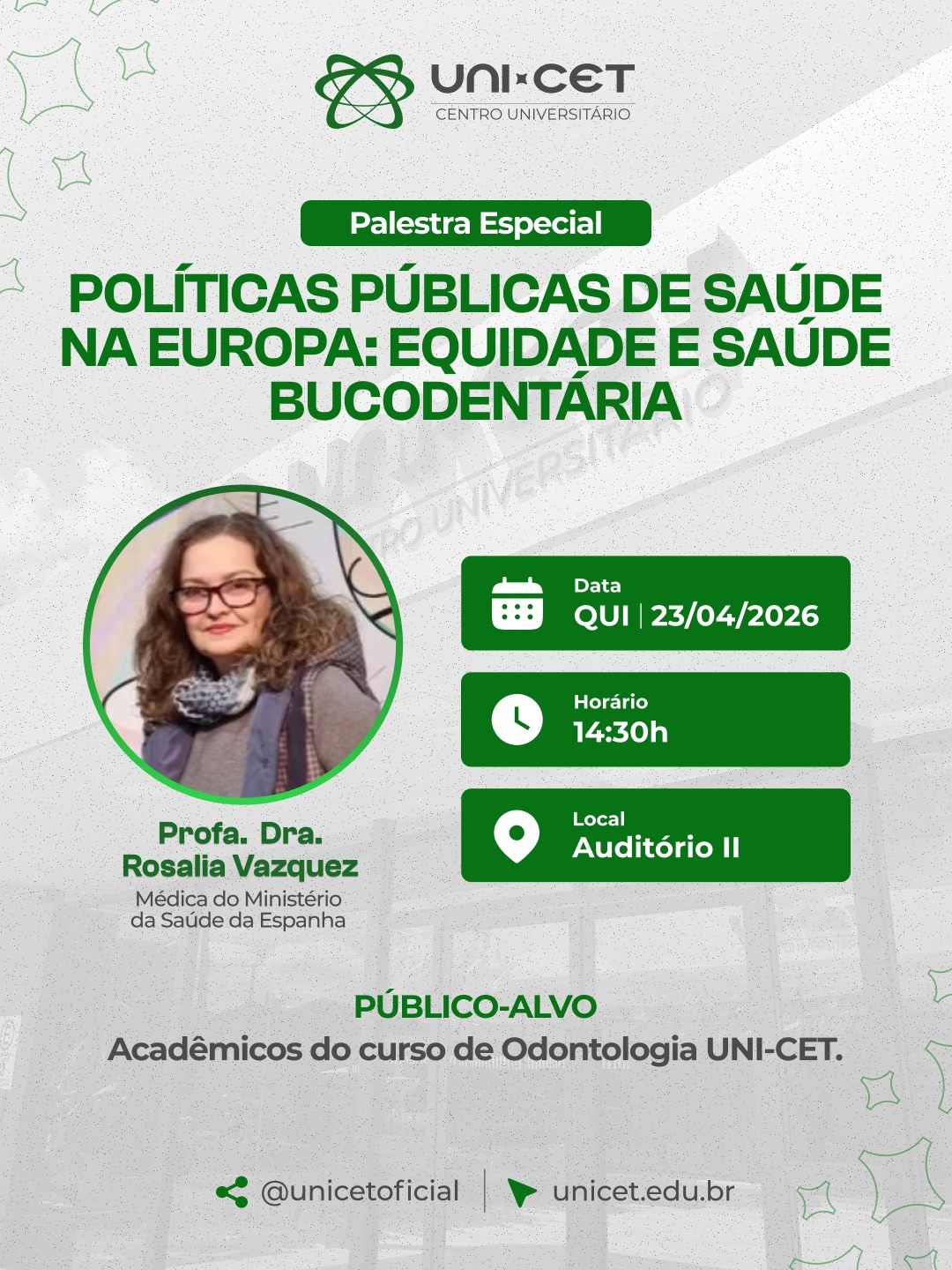 O Centro Universitário UNI-CET realiza, nesta quarta-feira (22), às 14h, no Auditório II, a palestra “Políticas Públicas de Saúde na Europa: Equidade e Saúde Bucodentária”, voltada aos acadêmicos do curso de Odontologia.