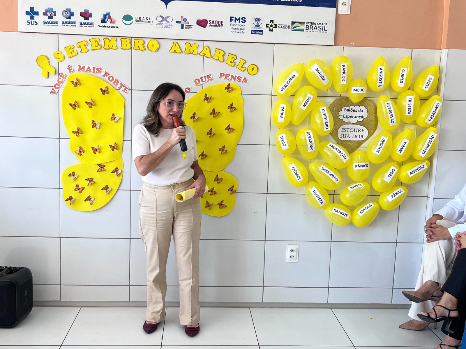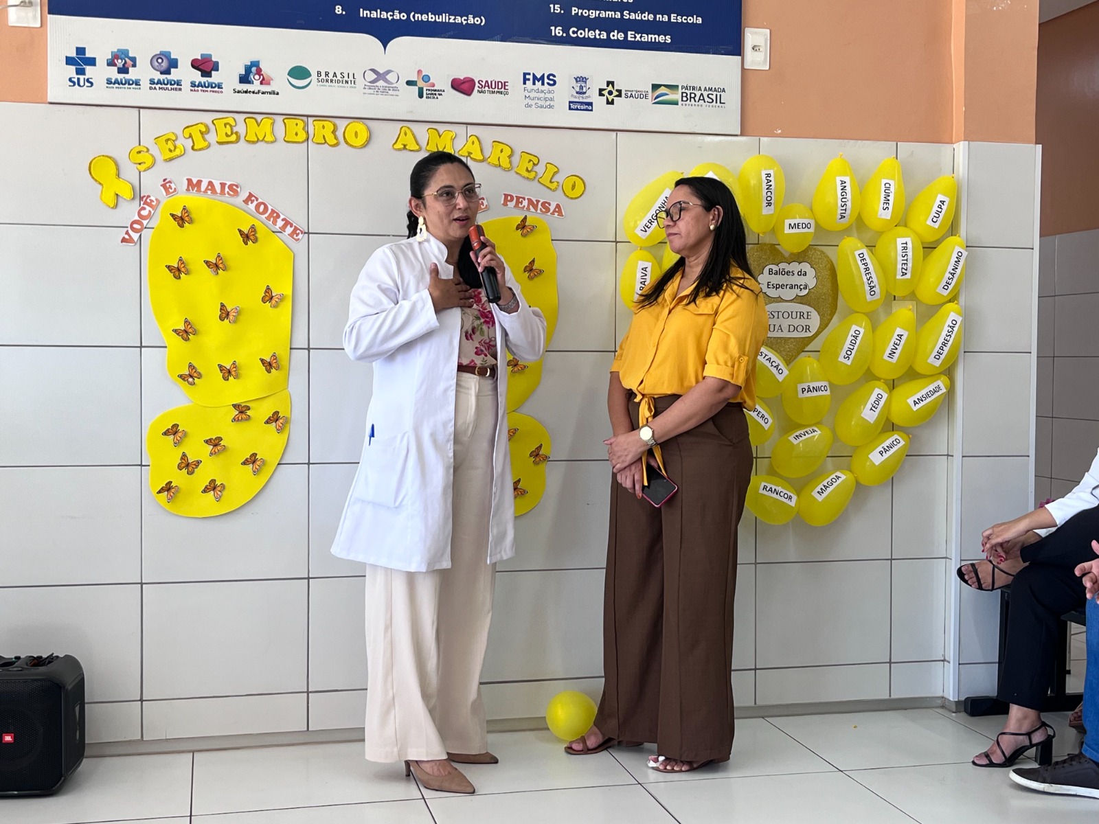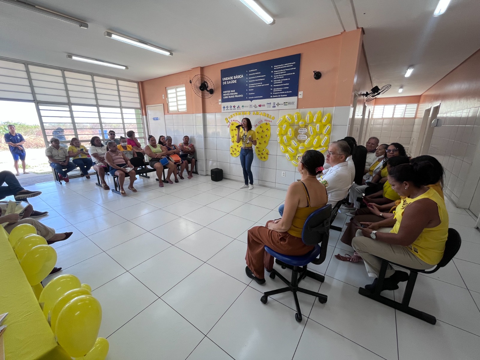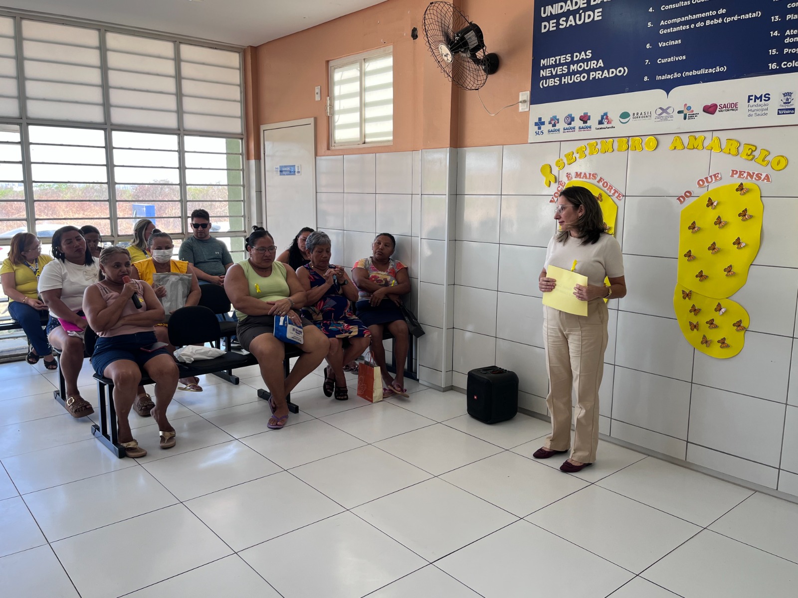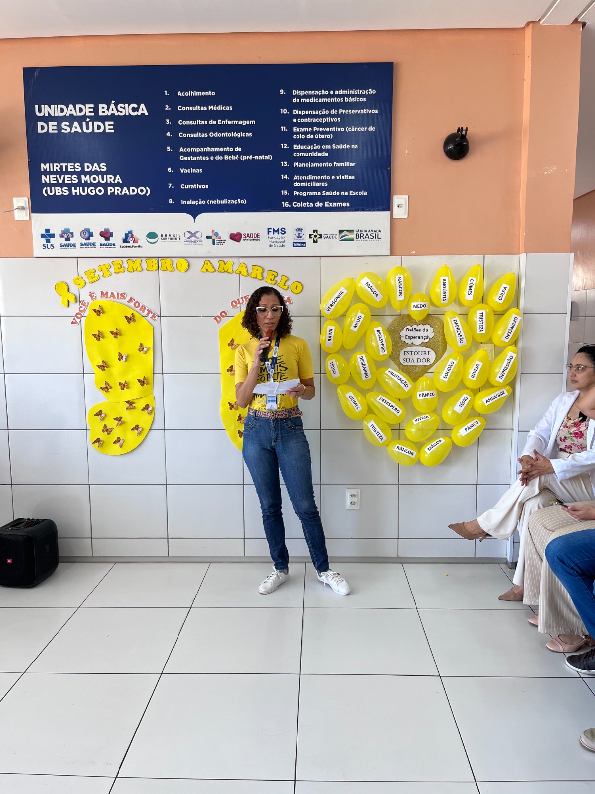 A convite da professora Dra. Karlla Monteiro, preceptora do internato de Medicina do UNI-CET, e da coordenadora da UBS Hugo Prado, Mariane Ximenes, a psicóloga Kátia Cilene participou, nesta quarta-feira (24), de um momento especial de diálogo com a comunidade do bairro Hugo Prado, em alusão à campanha Setembro Amarelo.