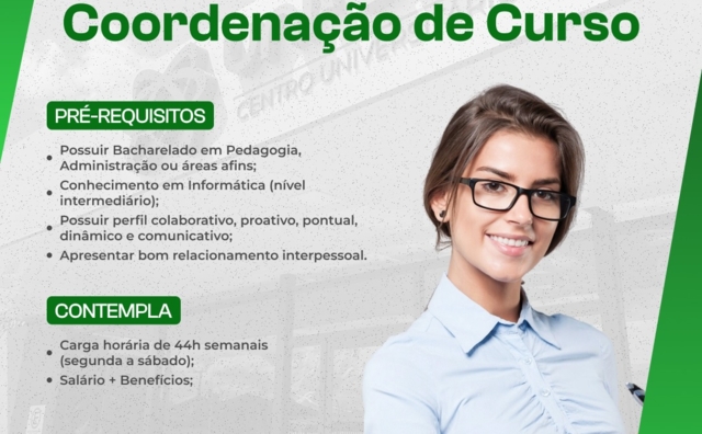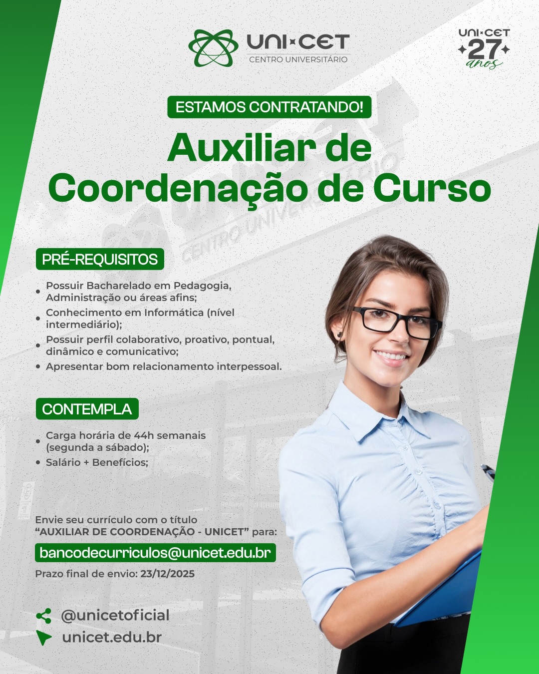 Envie seu currículo com o título “AUXILIAR ADMINISTRATIVO – UNICET” ou “AUXILIAR DE COORDENAÇÃO – UNICET” para e email [email protected] até dia 23 de dezembro de 2025.