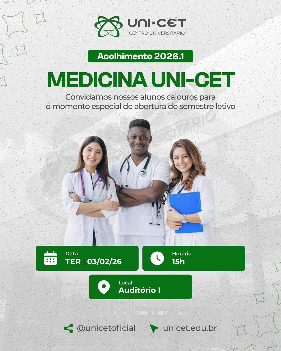 Com essa programação, o UNI-CET reafirma seu compromisso com a formação médica de excelência, aliando conhecimento técnico, vivências acadêmicas e cuidado com o processo de integração dos seus estudantes.