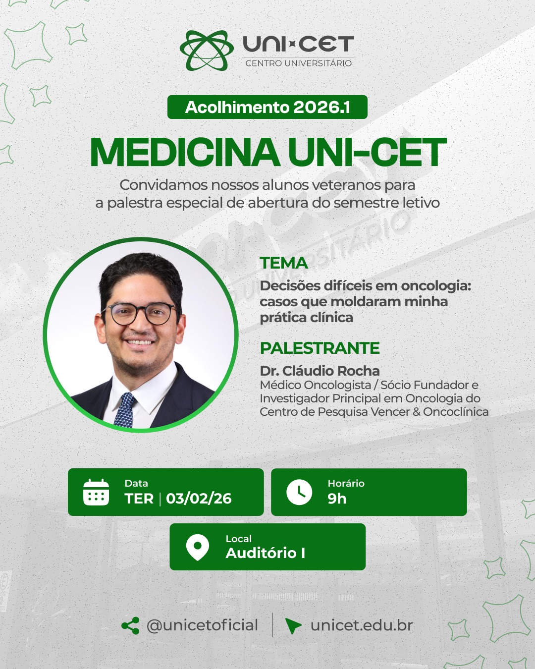Para os estudantes veteranos, a abertura do semestre contará com uma palestra especial ministrada pelo Dr. Cláudio Rocha, com o tema “Decisões difíceis em oncologia: casos que moldaram minha prática clínica”. O encontro abordará decisões clínicas complexas na área da oncologia, compartilhando experiências e aprendizados que contribuem para a construção de uma prática médica ética, responsável e baseada em vivências reais. A palestra será realizada na terça-feira, 3 de fevereiro, às 9h, no Auditório I – Tânia Sampaio.