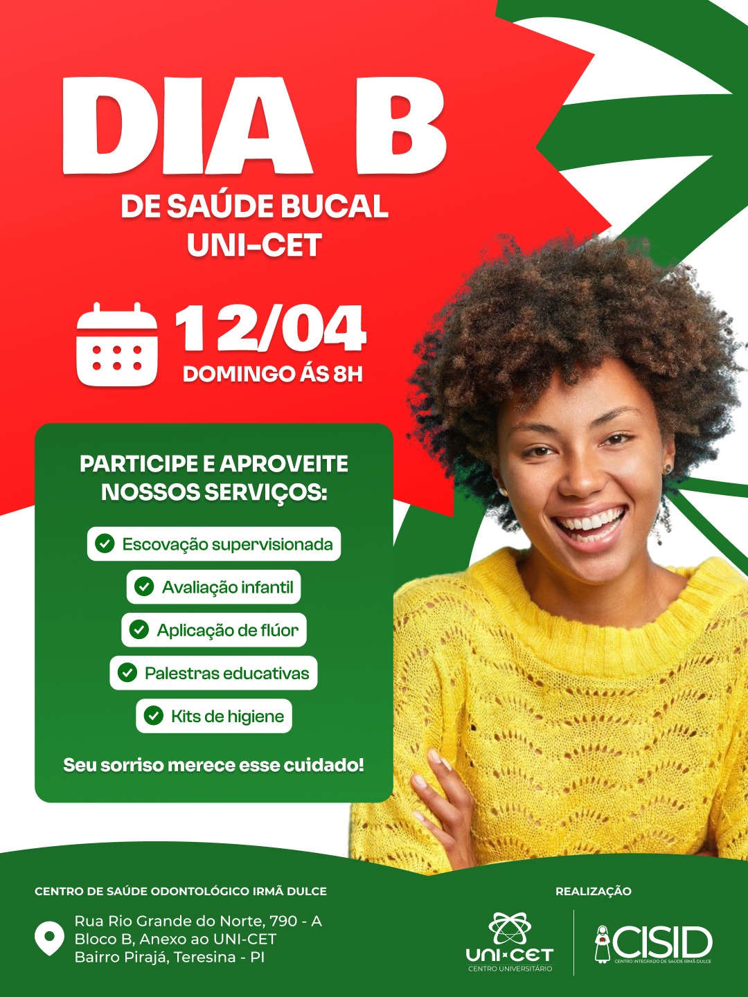 - Local: Centro de Saúde Odontológico Irmã Dulce - Rua Rio Grande do Norte, 790 – Bloco B (anexo ao UNI-CET), Bairro Pirajá – Teresina/PI