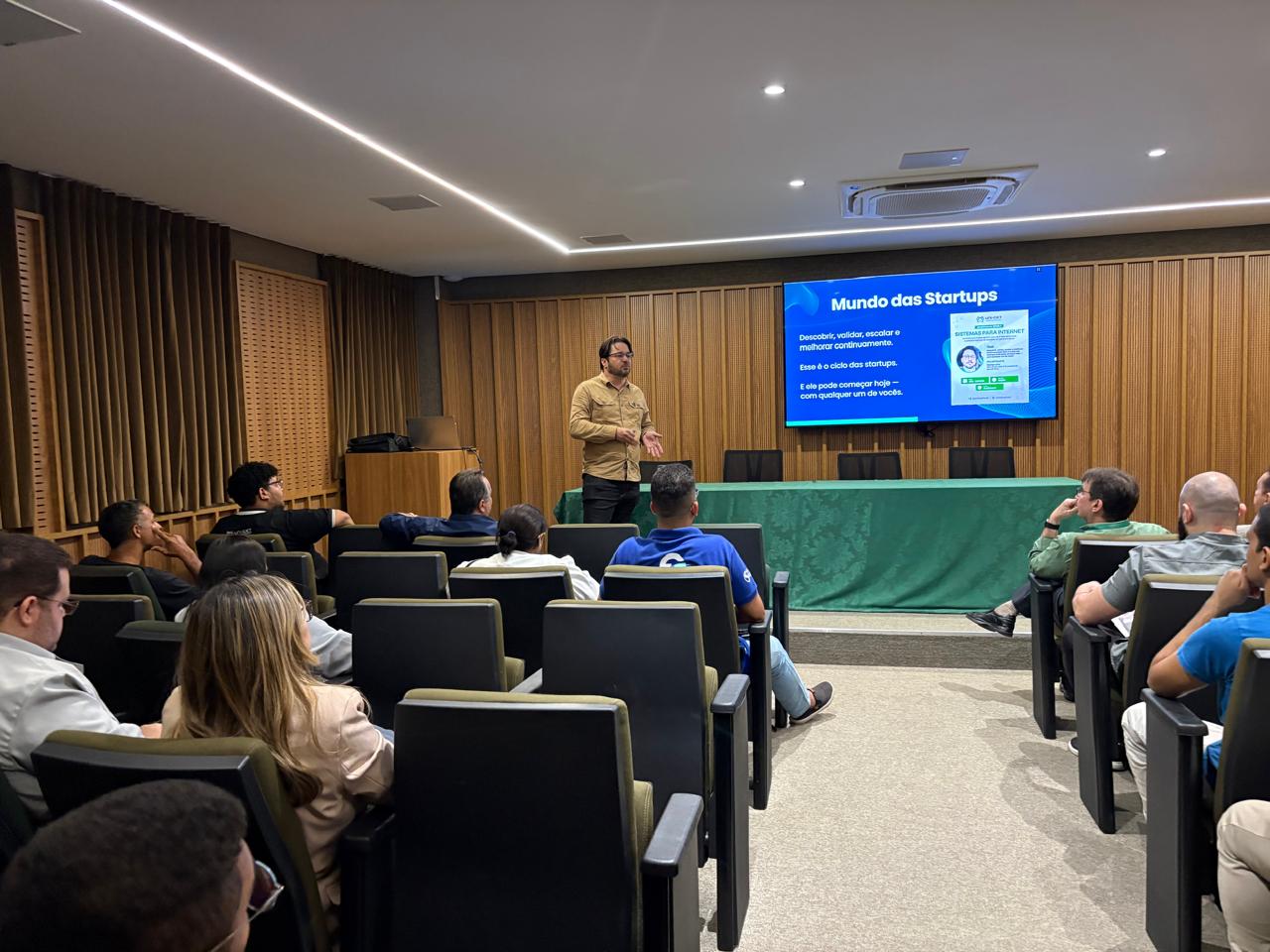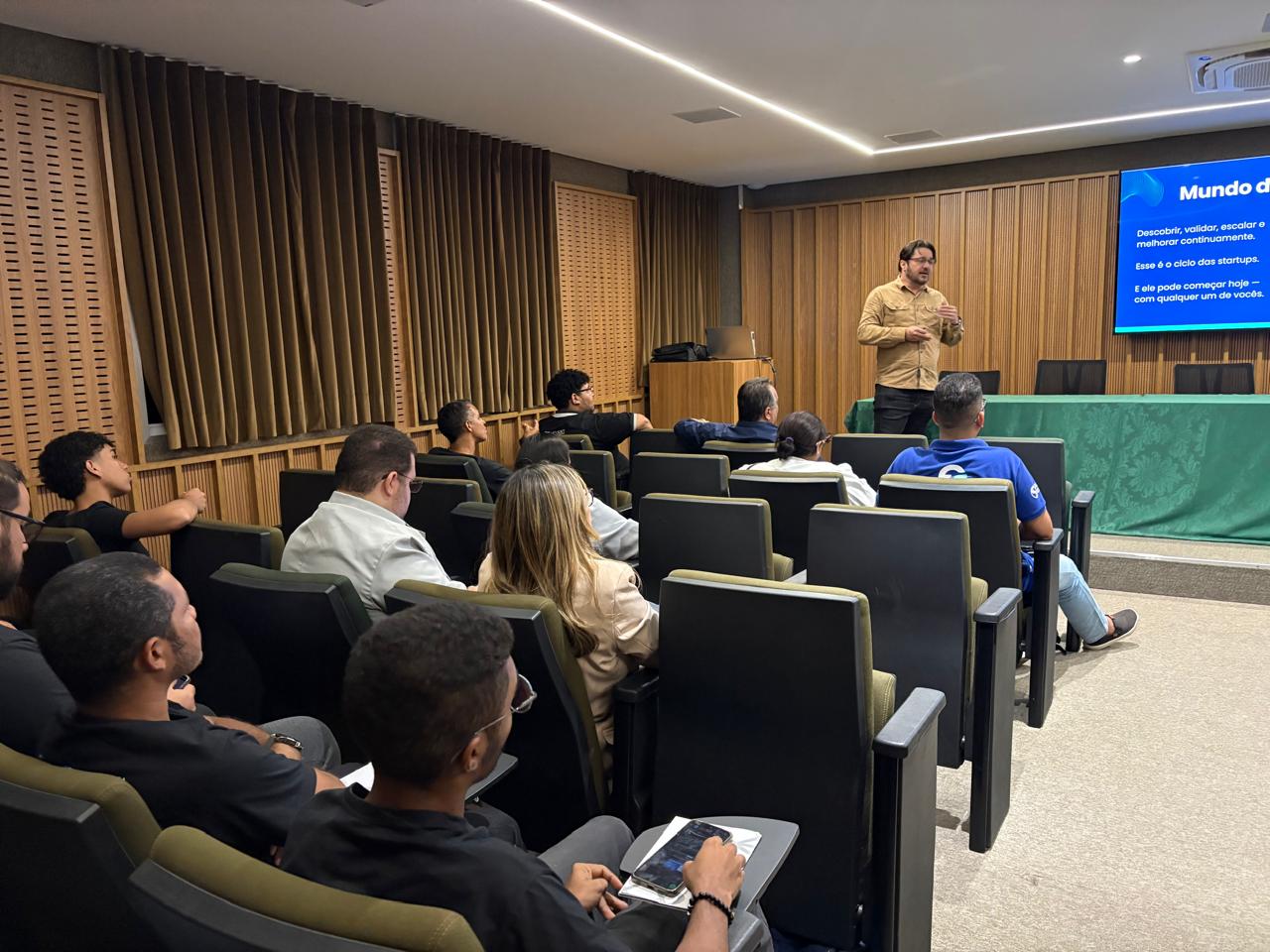 Como destaque da noite, os alunos participaram da palestra “Descobrir, validar, escalar e melhorar continuamente: o ciclo das startups”, ministrada por Rodrigo Lima, CEO da pix.cash e ex-presidente da AJE Piauí. Durante sua apresentação, o palestrante compartilhou reflexões sobre empreendedorismo, inovação e as diversas oportunidades que surgem a partir da integração entre tecnologia e visão estratégica de futuro.